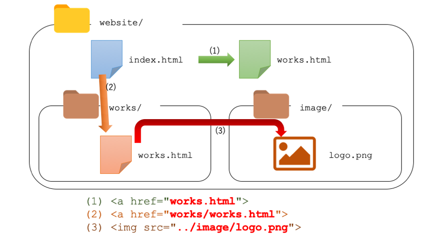 そうならないためのテクニックとして、参照元のファイルと参照先のファイルの相互の位置関係に基づき指定する相対パスによる位置指定の方法があります。