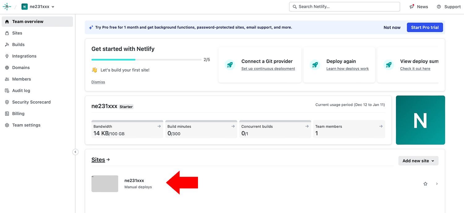 まずNetlifyで「Sites」から仮置きしているWebサイトを選択します。